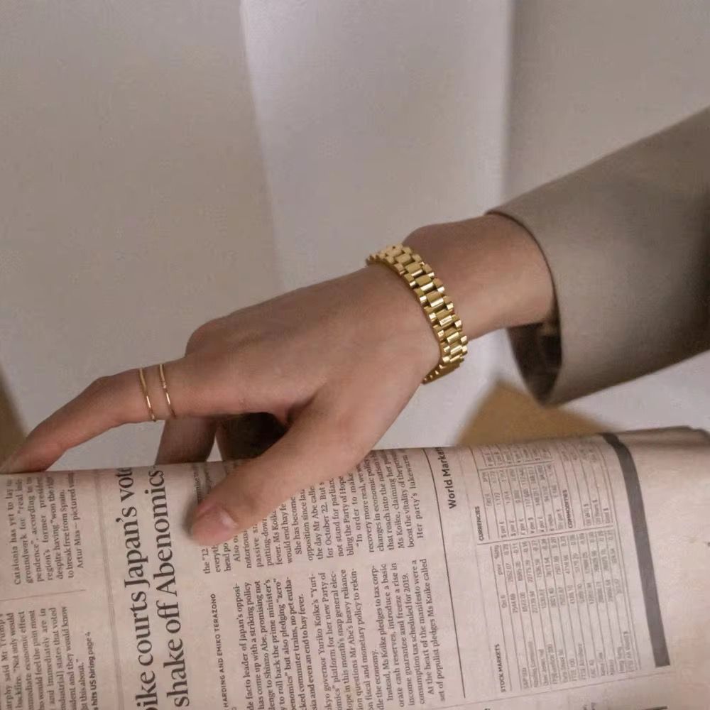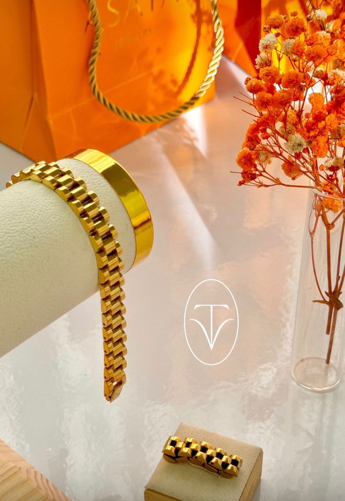 Upgrade your style game with our Watch Band Bracelet. Made with gold plated material, it comes with a matching ring (found under Rings). Stand out with this unique accessory!